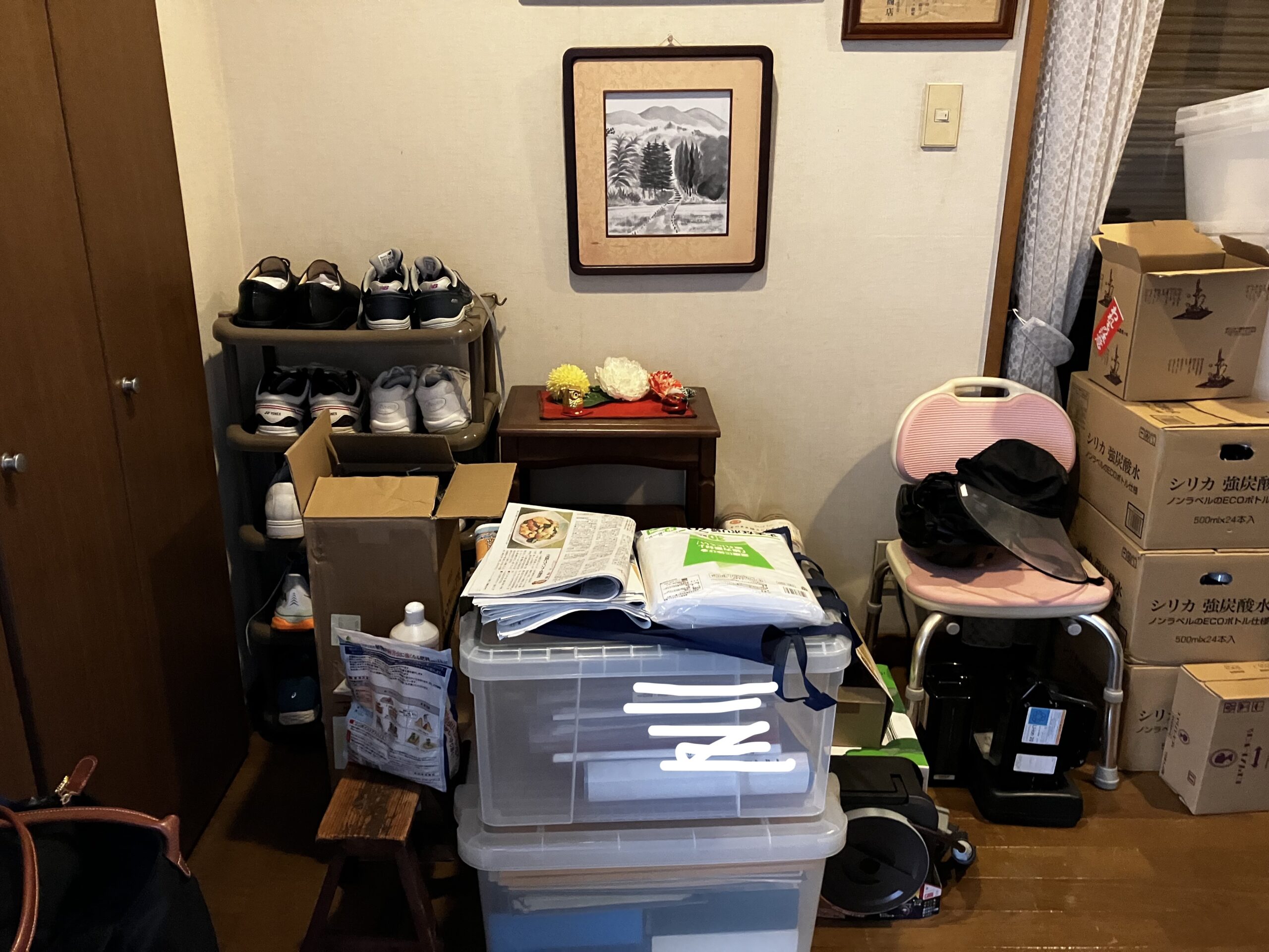 とおっしゃっていた書類や日用品が、玄関に積み上がっている状態でした。